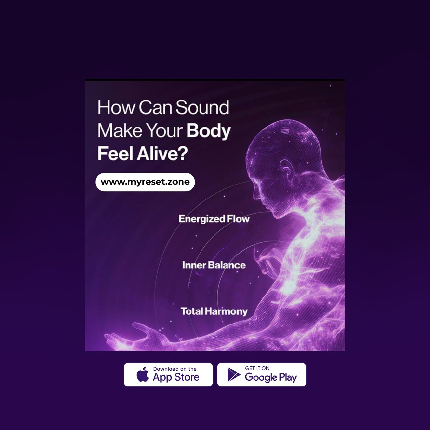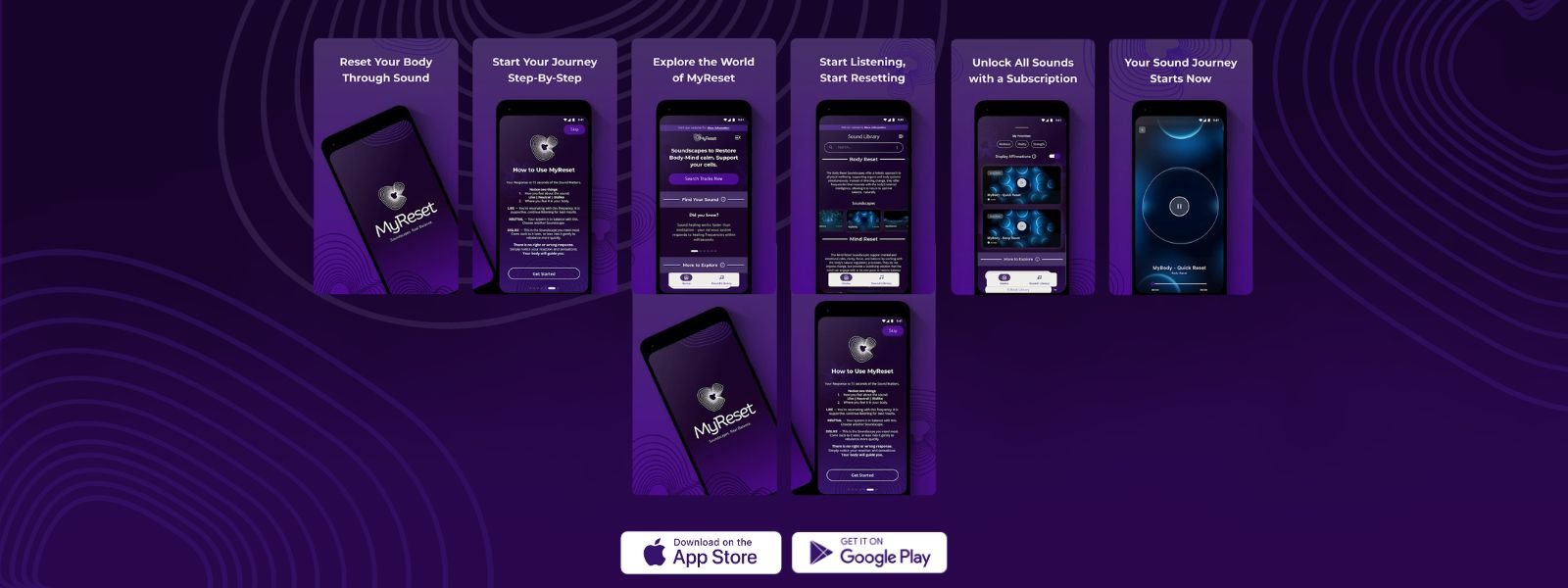 When listening to the MyReset Soundscapes, they match or complement your body’s natural vibrations, and this triggers resonance - helping disharmonised areas realign, balance, and restore themselves naturally.